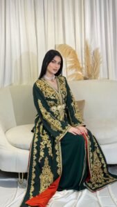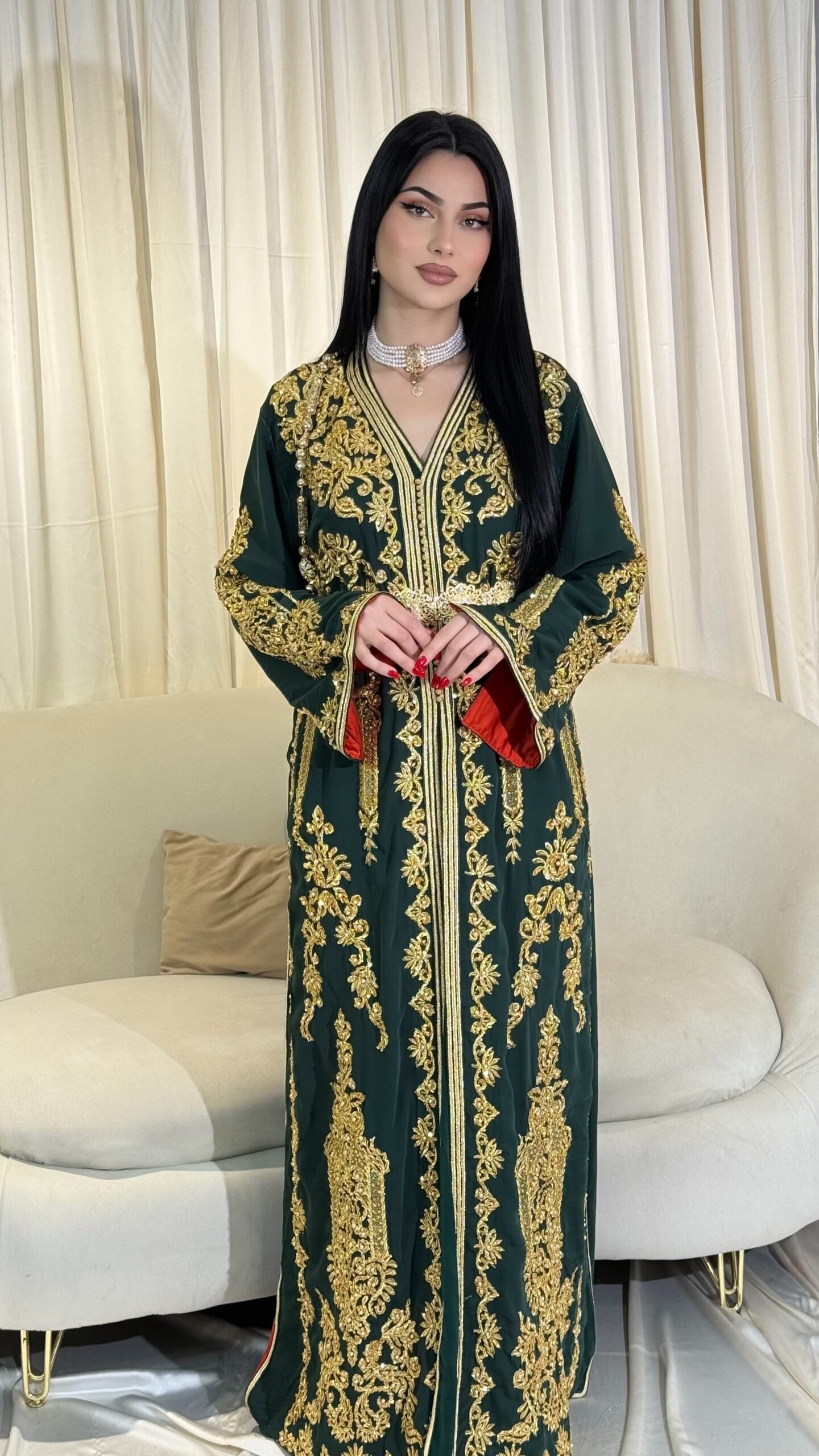 Caftan el amira caftan avec un model de broderie raffinée et unique ,de couleur vert émeraude broder avec fil d’or et orné de perlage a main , rehausser d’une doublure en soie rouge orangée pour plus d’elegance .
