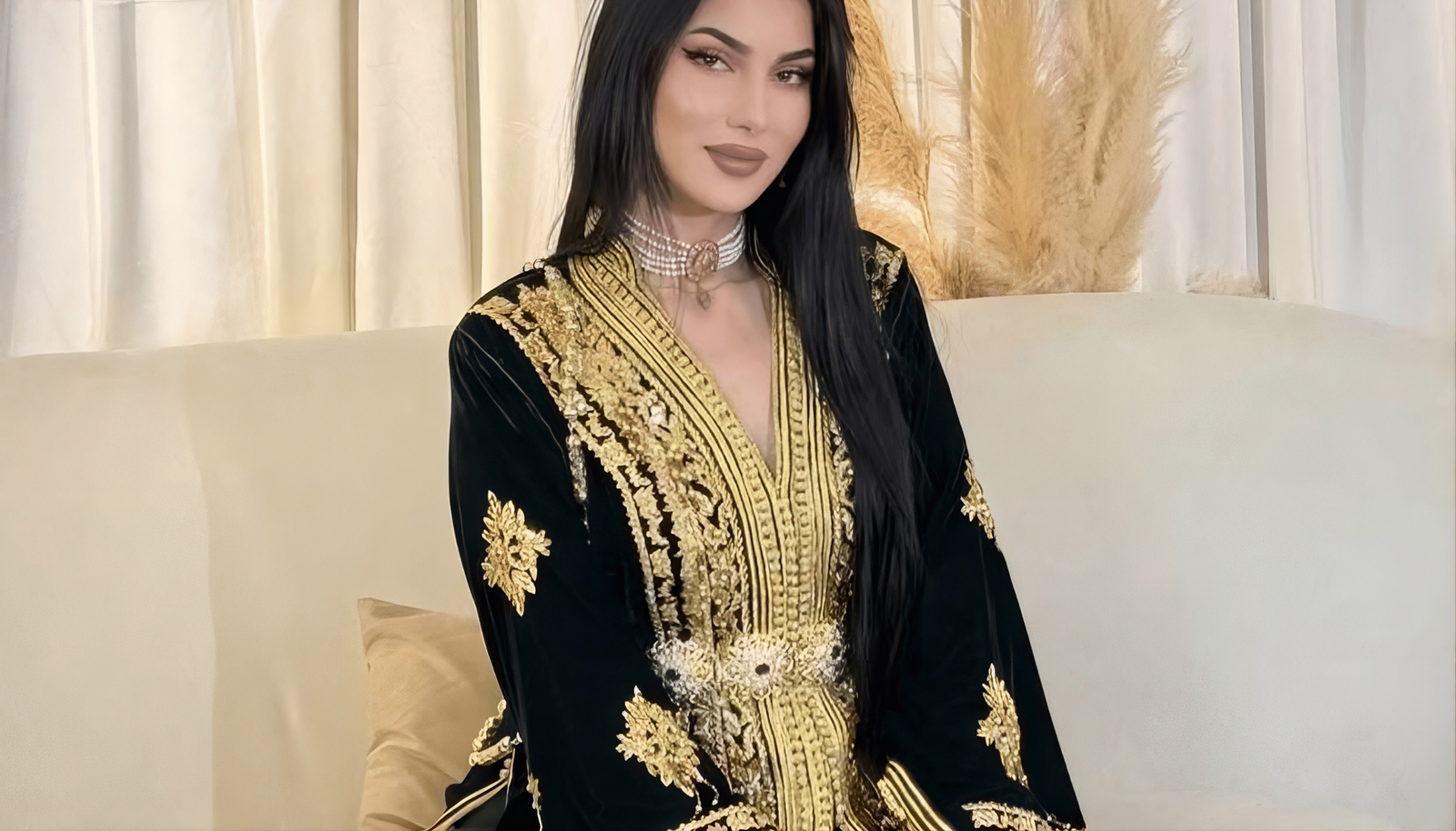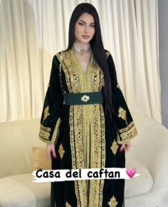 Caftan de tres grande qualité en velours vert royale ,travailler avec fil d’or et orné avec perlage a main , caftan de grande élégance avec son authenticité historique , c’est un faux deux pièce pour faciliter sa porté, de taille standards avec un tour de poitrine de 120cm.